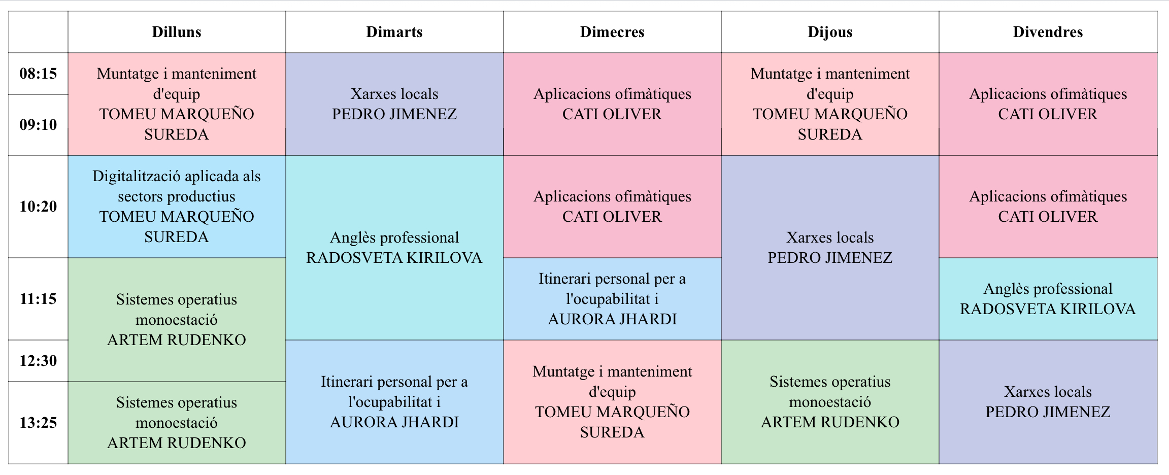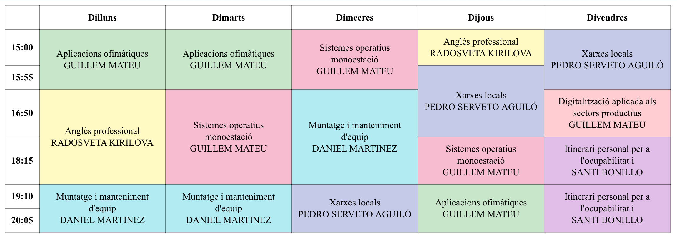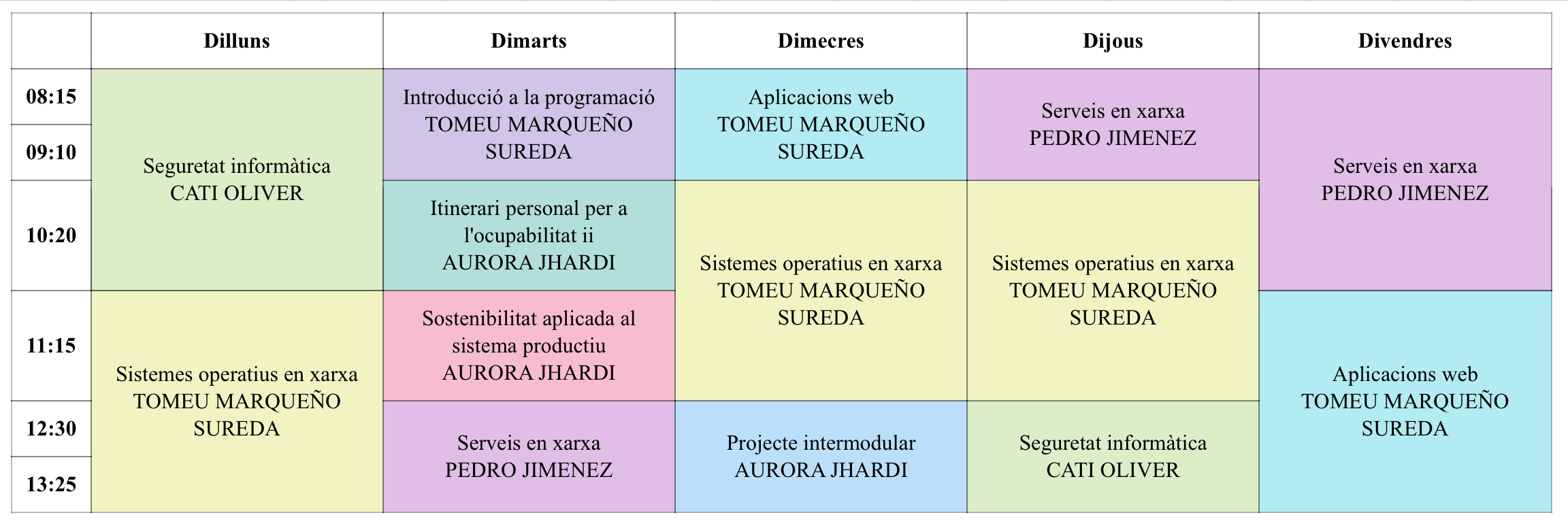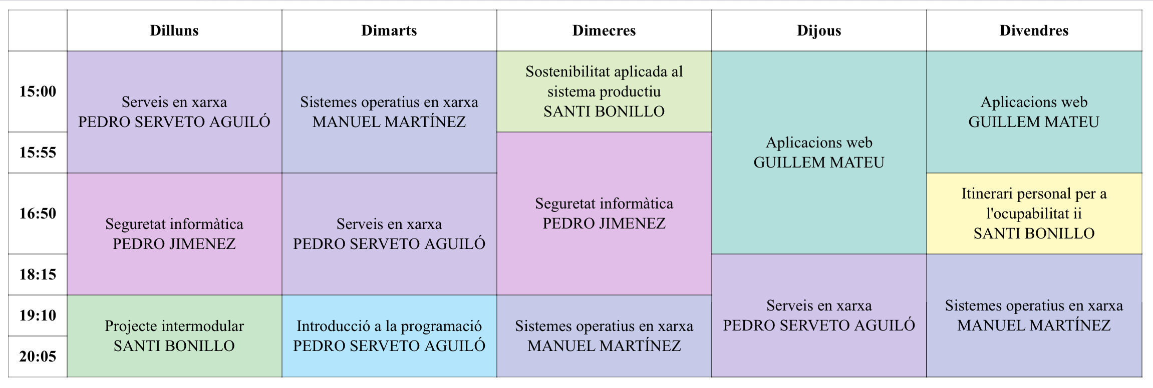 Informació Alumnes – Sistemes Microinformàtics i Xarxes – Horari Horari 2025/2026 Aquí podeu consultar els horaris del curs 2025/2026. 1er CFGM matí 2on CFGM matí 1er CFGM capvespre 2on CFGM capvespre
